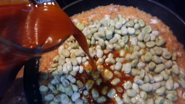 A continuación, añadimos las habas, que pueden ser congeladas o crudas y el caldo de pescado hasta que cubra las habas.