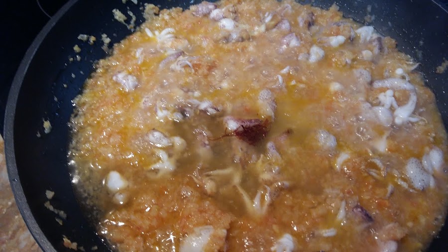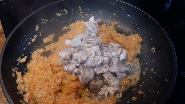 Cuando está bien sofrito todo, echamos los chipirones cortado en trocitos y salteamos durante 5 minutos.