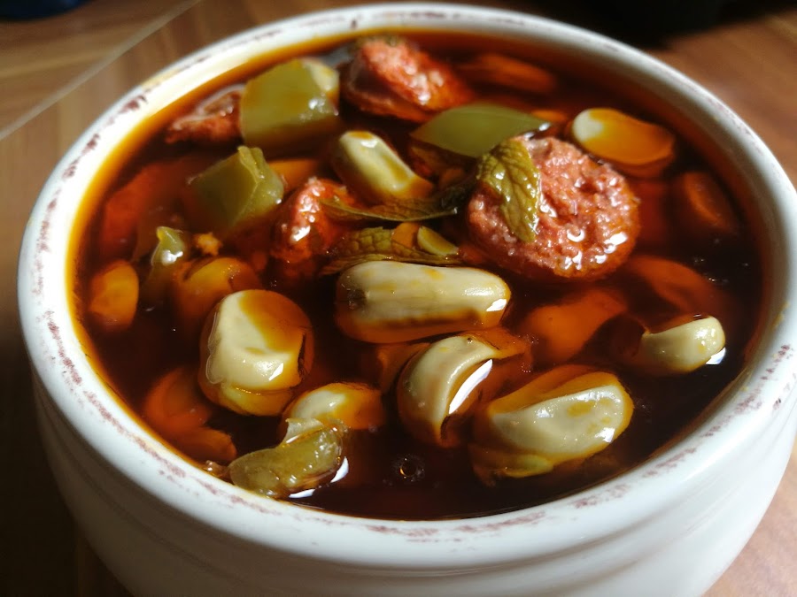 - Cuando estén doraditos, añadimos el caldo, la hierbabuena picada, los clavos machacados y dejamos hervir 10 minutos.