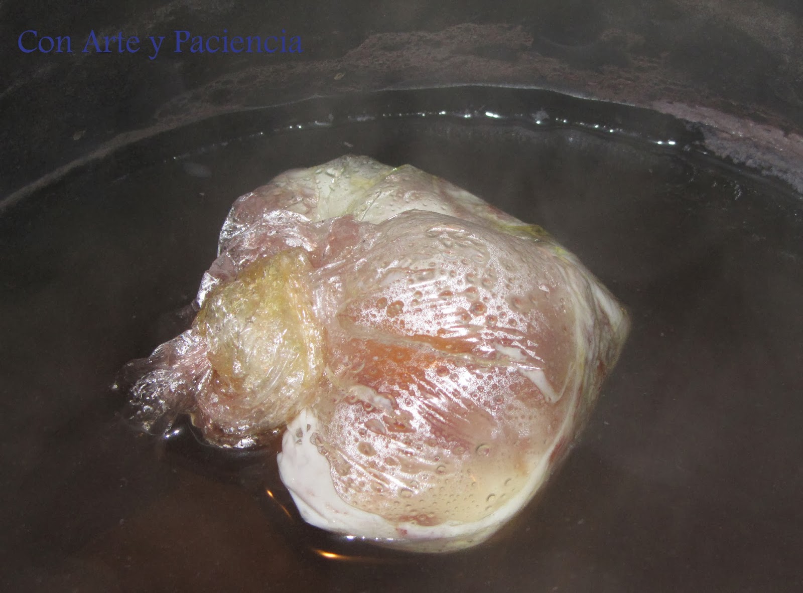 Cerramos haciendo un nudo y escalfamos 4 minutos en agua hirviendo. Si lo queremos más hecho lo dejamos unos 5 minutos.