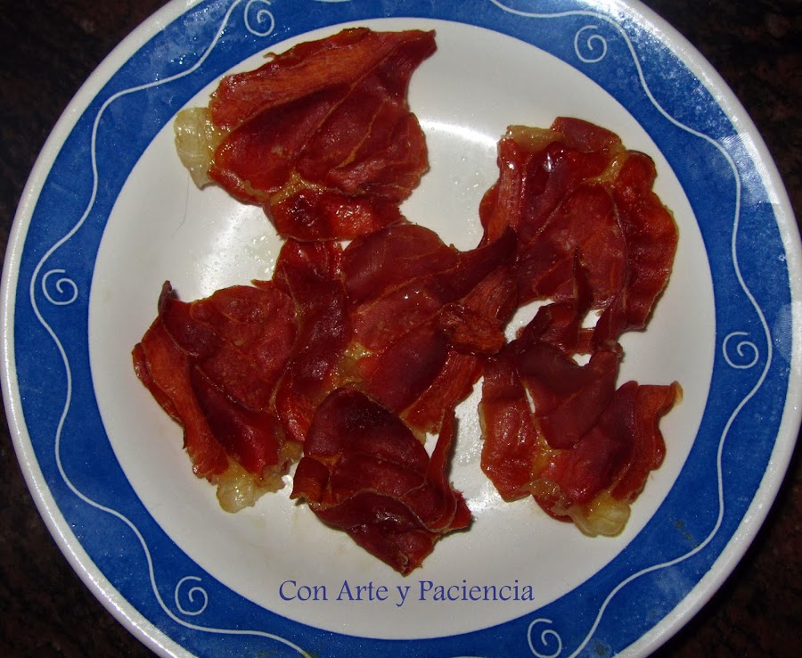 Introducimos el jamón serrano en el microondas a media potencia unos 30 segundos o hasta que esté crujiente. Lo Picamos en una picadora.