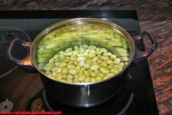 Desgranaremos todas las habas, cuando las tengamos todas listas pondremos los granos en una olla y cubriremos con agua. taparemos y la pondremos al fuego a fuego medio, las dejaremos cocer entre 10 y 12 minutos después de que rompa el agua a hervir, este tiempo puede variar dependiendo del tamaño del grano y de si está más tierna o no.