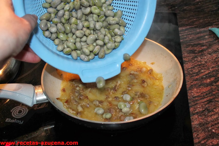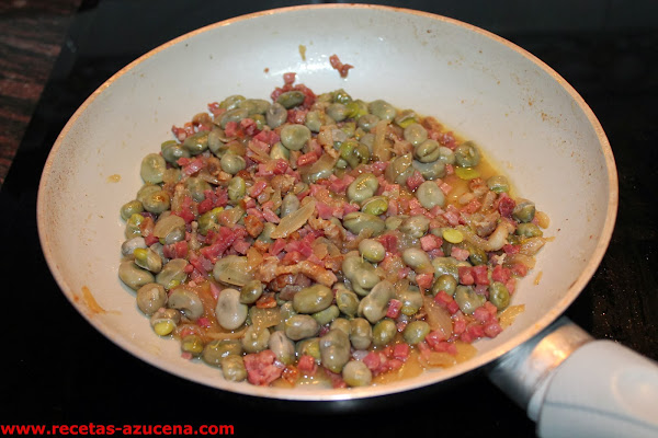Observaremos el vino y cuando haya reducido a la mitad añadiremos las habas que teníamos cocidas, removemos y dejamos sofreír 2 minutos más.