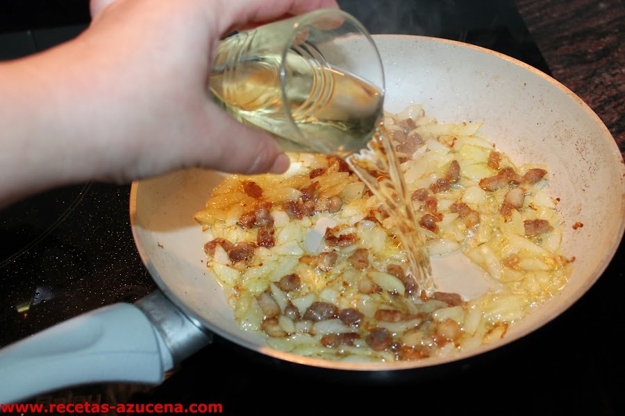 Cuando la cebolla este empezando a tomar color dorado añadiremos el vino, y dejaremos que reduzca.