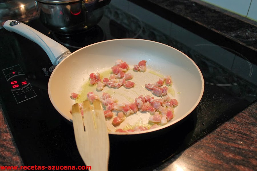 Ponemos una sartén al fuego, a fuego medio, cuando este caliente pondremos un fondo de aceite y añadiremos la tocineta troceada, con ayuda de un tenedor de madera la repartiremos para que no se quede pegada una a otra, cuando la tocineta se haya dorado por todos lados añadiremos la cebolla, salpimentamos y dejamos sofreír hasta que la cebolla empiece a tomar color.