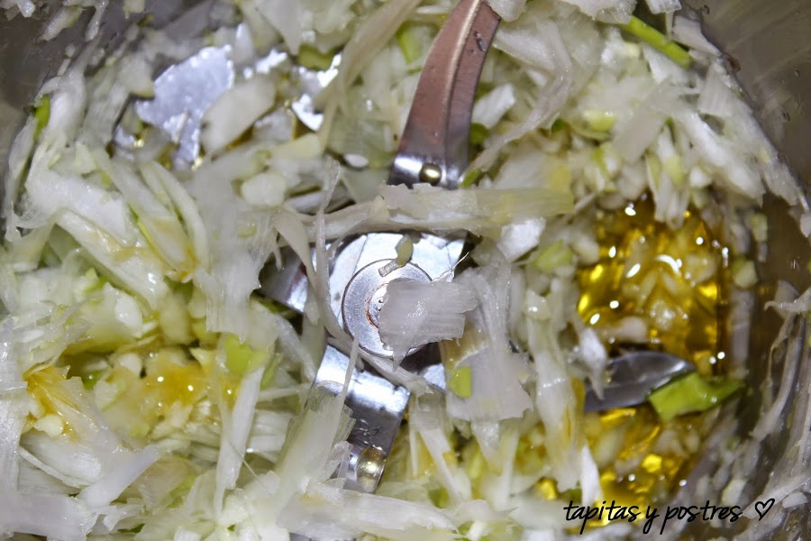 Cortamos las cebolletas lavadas por la mitad y la ponemos en el vaso, las picamos 5 segundos a velocidad 4.