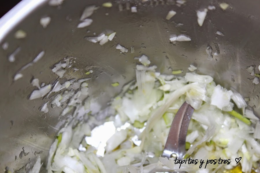 Añadimos el aceite y sofreímos 10 minutos, varoma, velocidad 1, pero no ponemos el cubilete sino el recipiente varoma con el saquito con el huevo.