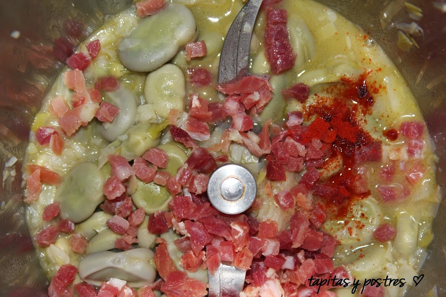 Agregamos el jamón y el pimentón y dejamos cinco minutos más. Comprobamos si las habas están tiernas, si no ponemos dos minutillo más.