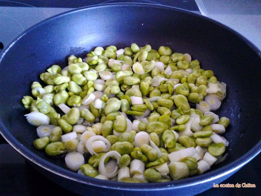 En una sartén ponemos el aceite a calentar, echamos las habas y la cebolla, freímos durante 10 minutos a fuego suave.