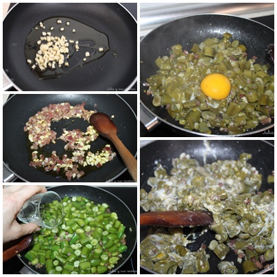 En una sartén ponemos el aceite y echamos los ajos picaditos, los rehogamos un poco y añadimos el jamón cortado en taquitos, lo rehogamos y añadimos las habas, les ponemos un poco de sal y el vasito de agua. Dejamos que hiervan hasta que se consuma el agua.
