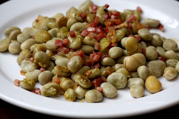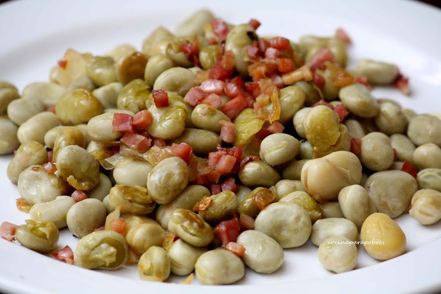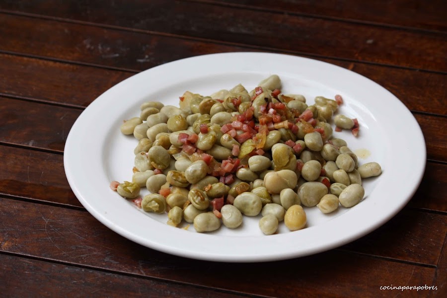 salCocemos las habas en agua hirviendo durante 25 minutos, pasado este tiempo apartamos, escurrimos y reservamos. También podemos comprar las habas ya cocidas, y este paso lo obviamos.