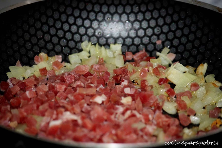 En una sartén con aceite pochamos la cebolla previamente pelada y picada, cuando empiece la cebolla a tomar color agregamos el jamón. Movemos y dejamos unos minutos para que se cueza el jamón y suelte su jugo.