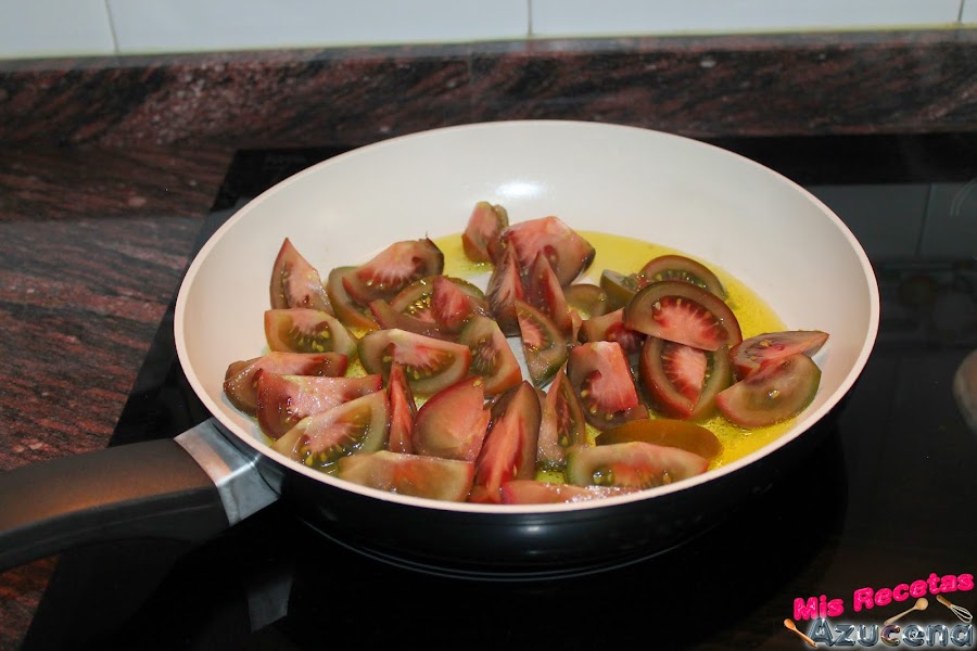 Ahora ponemos una sartén al fuego, a fuego alto, cuando este caliente añadiremos un fondo de aceite y los tomates que previamente los habremos lavado y picado en gajos, los dejaremos sofreír durante 5 minutos, yo los deje sin pelar, aunque si queréis podéis quitarles la piel.