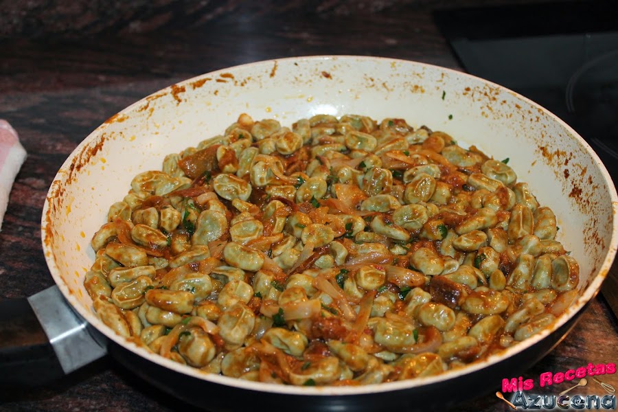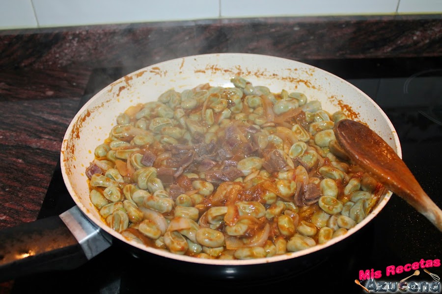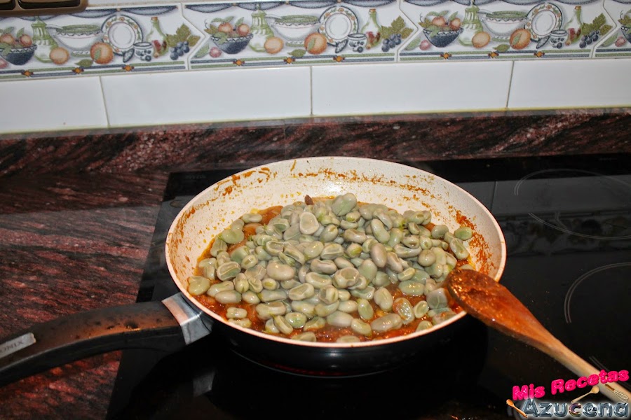 Con ayuda de un escurridor le quitaremos el agua a las habas y pasados los 6 minutos las añadiremos a la sartén, removemos todo y las dejaremos sofreír 1 minuto más.