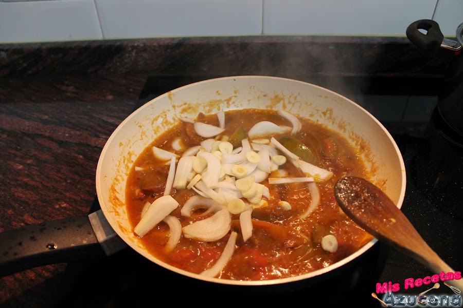 Pasados los 5 minutos por los tomates añadiremos la cebolleta y los ajos, salpimentamos, removemos todo y lo dejaremos sofreír durante 6 minutos más.