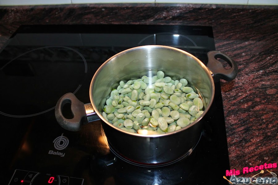 Lo primero que haremos será desgranar las habas y ponerlas a cocer con un poco de sal, cuando el agua rompa a hervir las dejaremos durante 3 minutos.