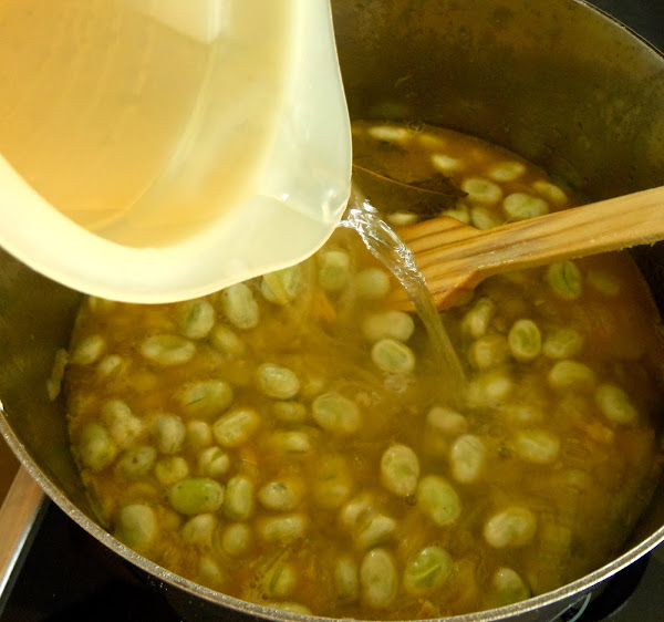 Seguidamente agrega el agua y la pastilla de caldo de verduras; remueve con tu cuchara de madera, tapa la cacerola y deja cocer las habas a fuego medio, nº 6 de la placa vitrocerámica durante 45 minutos o hasta que las habas estén tiernas.