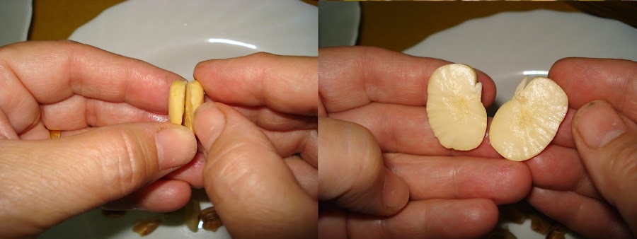 Ahora viene lo más engorroso, quitarles la piel a las habas, para ello las colocamos en un colador grande para escurrirles el agua y una a una le clavamos un poco una uña y tiramos de la piel, separamos las dos partes de la semilla (cotiledones) y las vamos poniendo en una bandeja a la cual le hemos colocado papel absorbente.