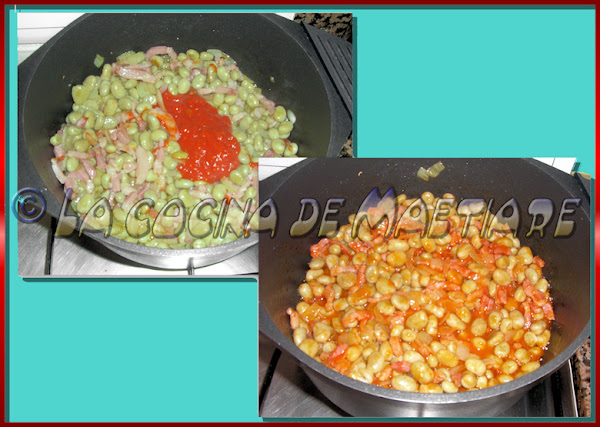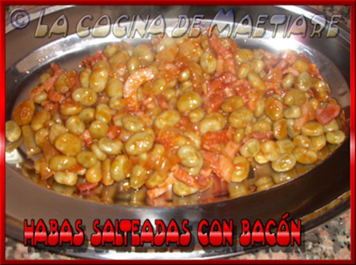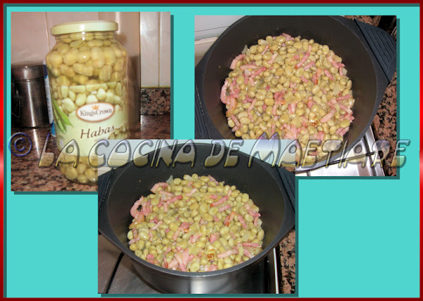 Cuando el bacón haya soltado algo de su grasa y pero aún no haya dorado añadir las habas escurridas de su líquido y enjuagadas bajo el grifo. Cocinar durante 2 minutos.
