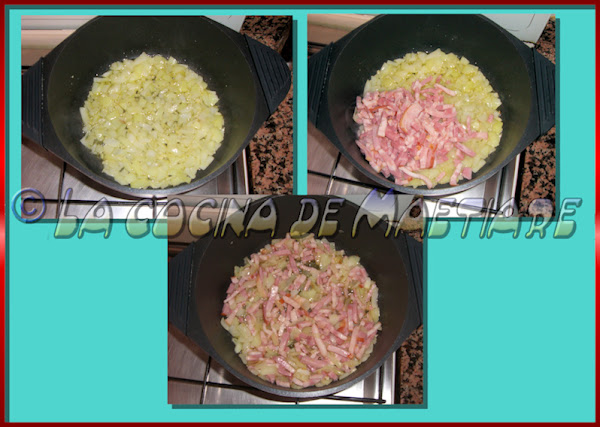 En una cacerola antiadherente sofreír en aceite la cebolla picada ligeramente salada. Cuando comience a transparentar añadir el bacón ahumado troceado en lascas y sofreír el conjunto a fuego medio.