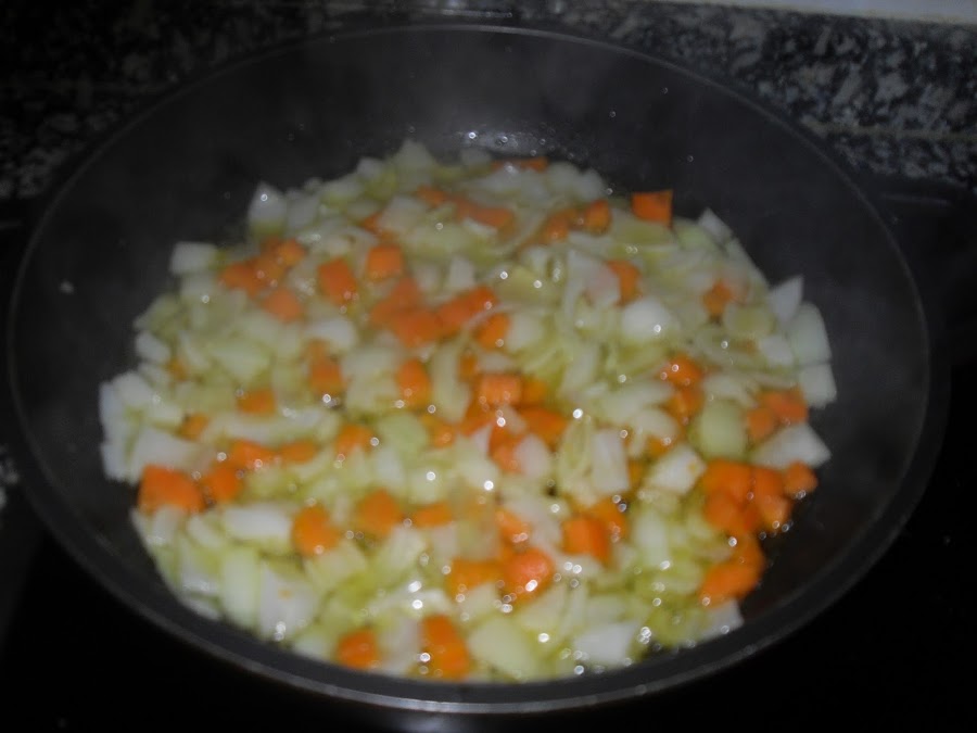 Elaboración:Pelar y picar la cebolla y la zanahorias en brunoise (pequeñito).