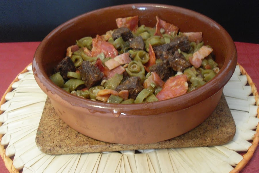 Elaboración:Saltear con un hilo de aceite el bacon, sacar y reservar. en el mismo aceite marcar la butifarra a trocitos, y a continuación el lomo. Sacar y reservar.