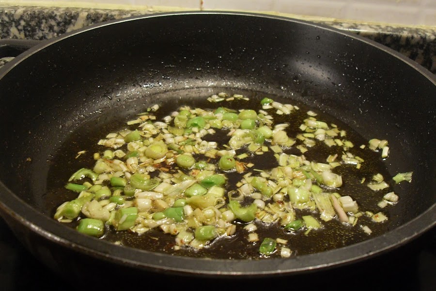 Limpiar y picar las cebolletas y pochar con el anterior aceite sobrante. Añadir los dientes de ajos picados y dar unas vueltas.