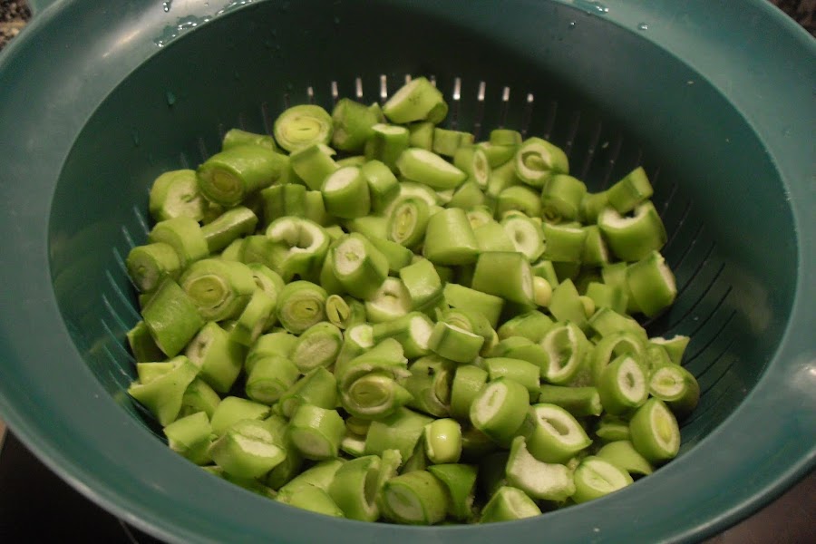 Lavar y picar pequeñas las habas. Poner a dar un hervor con una pizca de sal, durante 10 o 15 minutos hasta que estén tiernas, escurrir y reservar.