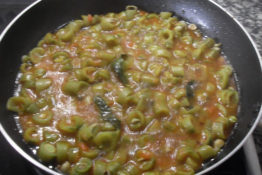 Una vez listo el sofrito, añadir las habas, el resto de embutidos y unas hojas de menta.