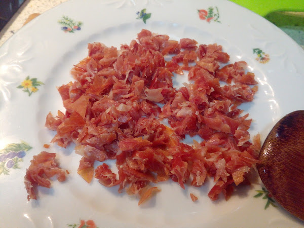 Picar el jamón serrano en trozos pequeños y reservar.