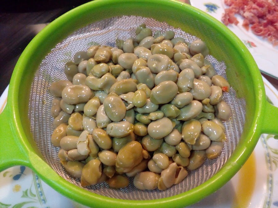 Escurrir las habitas baby con un colador y parte del aceite echarlo en una sartén.