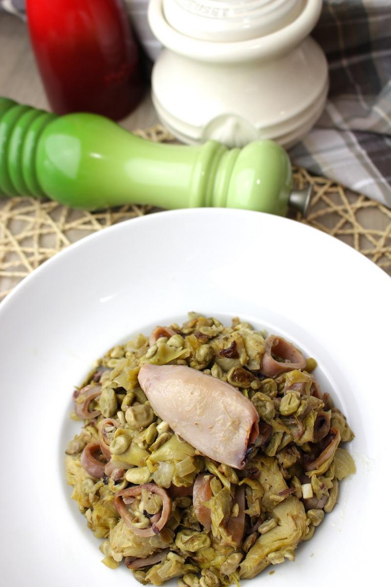 Delicioso salteado de habitas fritas con chipirones rellenos y alcachofas.