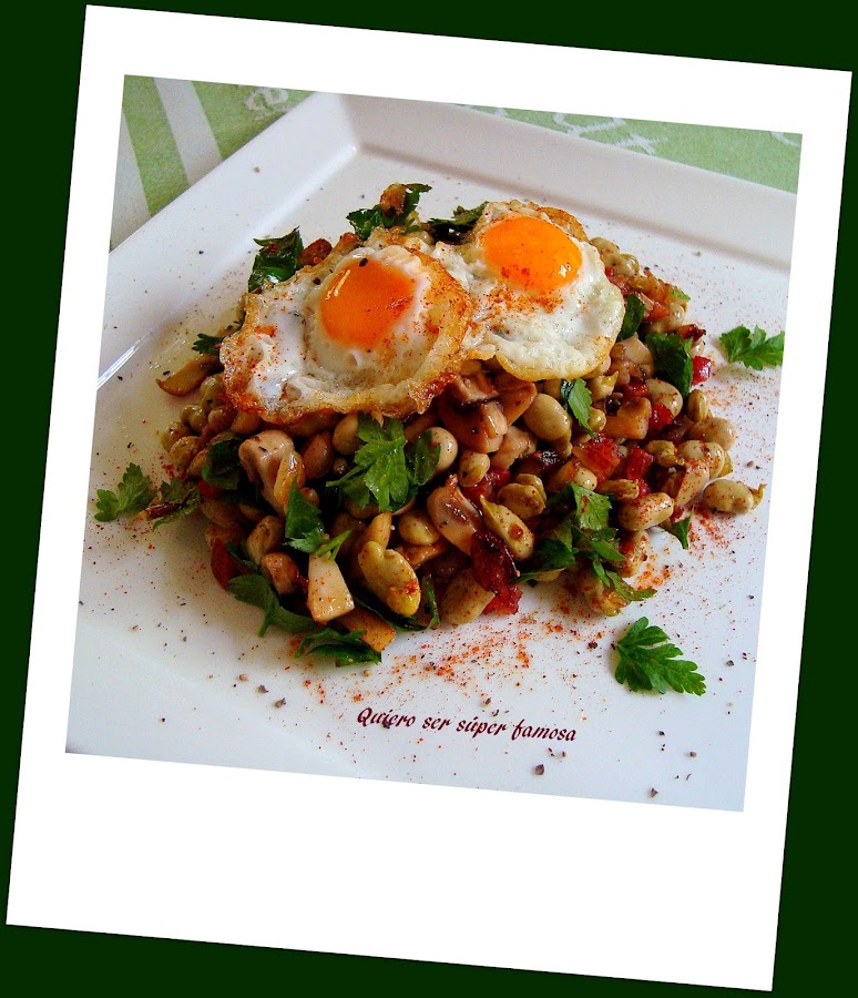 7 - Picar el perejil y mezclar con las habas. Servir inmediatamente con los huevos fritos.