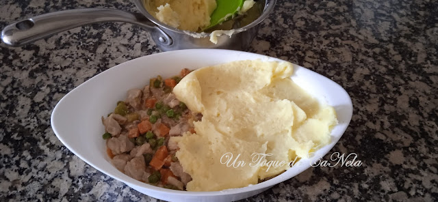 Verter en la fuente de hornear, cubrir con el puré de patatas e igualar la superficie.