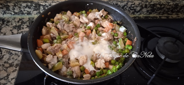 Agregar el pollo, los guisantes, la zanahoria y el calabacín, cortados en cubos. Cocinar 15 minutos a fuego medio.