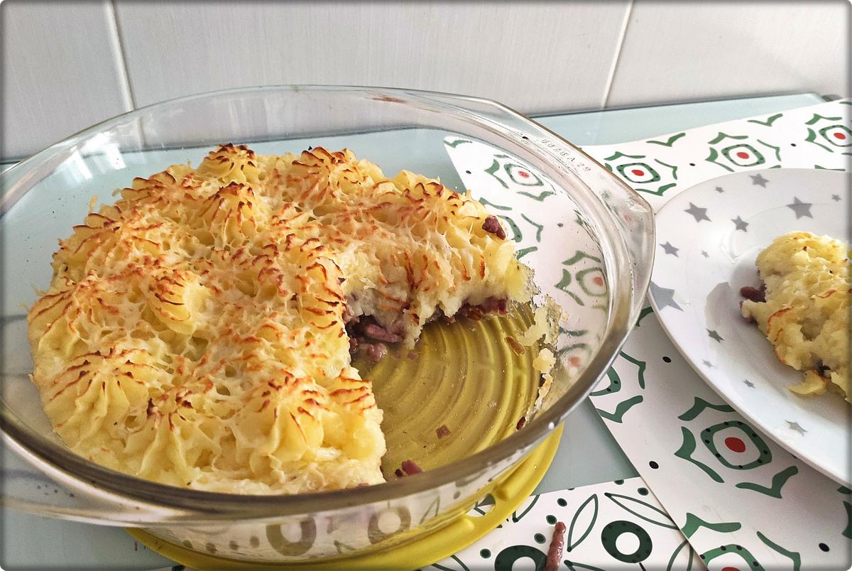 Pasamos el puré a una manga pastelera con boquilla rizada y vamos colocandolo sobre la mezcla de carne.