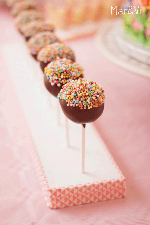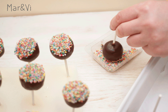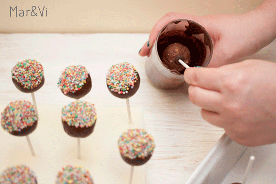 Para decorarlos, vamos a introducir primero cada cake pop en un recipiente con chocolate fundente derretido (hacerlo según las recomendaciones del fabricante) haciendo movimientos circulares, hasta que toda la bolita de bizcocho este cubierta. A continuación, decoramos con sprinkles, con cuidado de no hacer mucha presión para no deformar las bolitas.