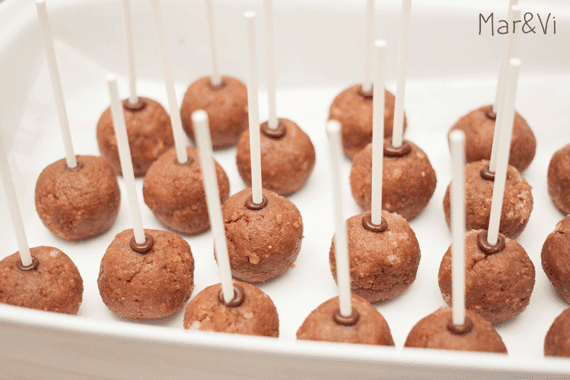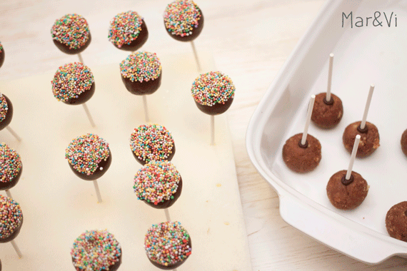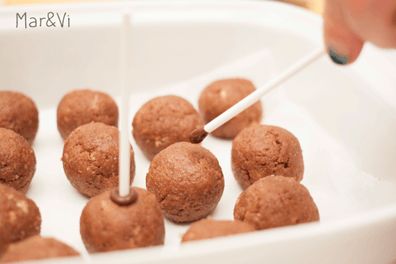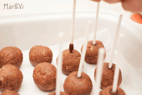 Cuando tenemos todas las bolitas de bizcocho con el correspondiente palo, llevamos otra vez a la nevera hasta que el chocolate solidifique. De esta manera, el palito nos quedará bien sujeto.