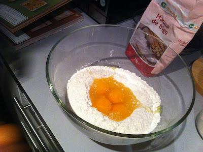 Se ponen los huevos en el centro de la harina en un bowl o mesa de trabajo.
