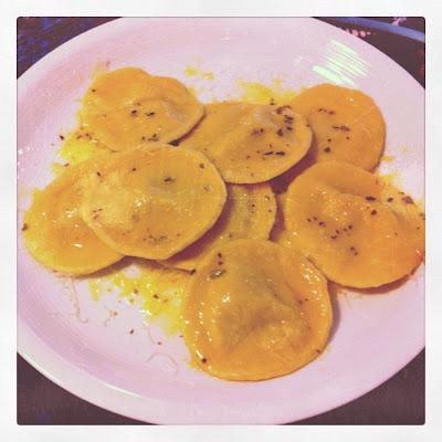 Los raviolis rellenos de calabaza y amaretti con salsa de mantequilla, salvia y parmesano rallado.