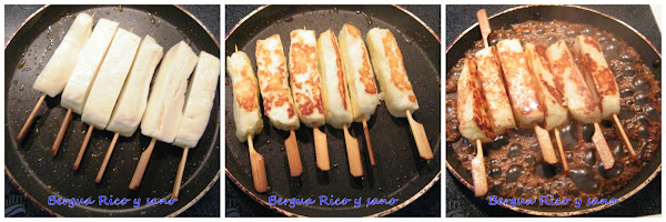 6. En la misma sartén vamos a preparar el halloumi. No tiene porqué ser en brochetas. A mí me gusta por la presentación y la comodidad al cocinar, pero no es imprescindible. Primero cortamos el queso en 6 tiras gruesas. Después las atravesamos con cuidado con la brocheta. Si usamos palillos de madera, es buena idea remojarlos antes en agua para que no se quemen.