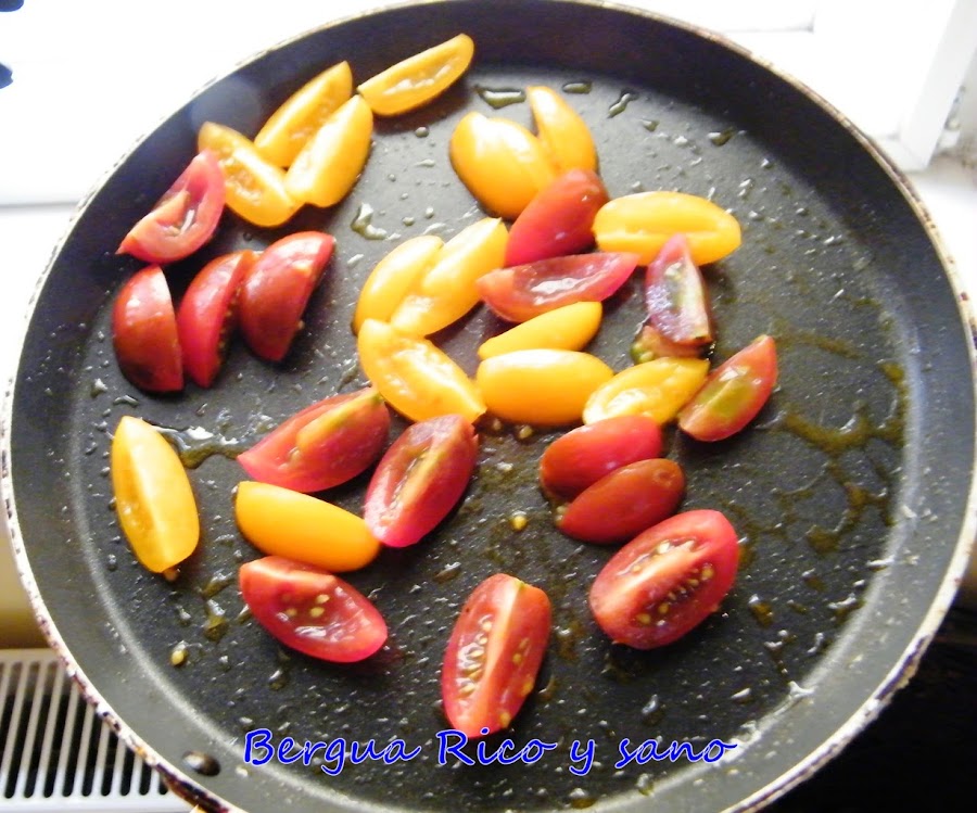 5. En una sartén calentamos 1 cucharada de aceite de oliva y salteamos durante 30-50 segundos los cuartos de tomate cherry. Reservamos.