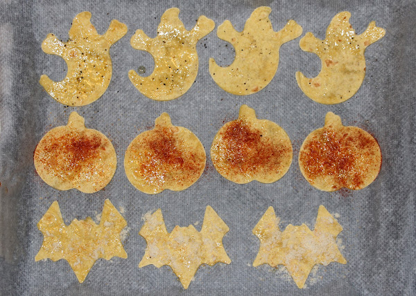 Pincelar con aceite por las dos caras, poner en un bandeja de horno, y sazonar las calabazas con sal y paprika, los murciélagos con sal y queso parmesano en polvo, y los fantasmas con sal y pimienta.