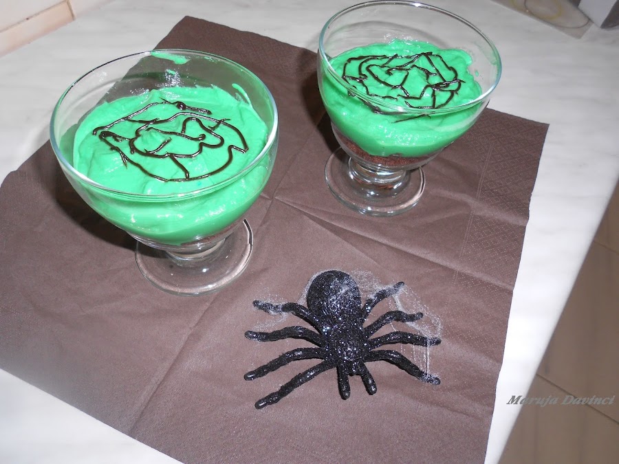 Como dije tenía bizcocho de chocolate, lo desmigué, lo puse en la base de las copas y luego la crema verde viscooooosaaaa. Decoré con lapiz de chocolate de DR Oetkler.