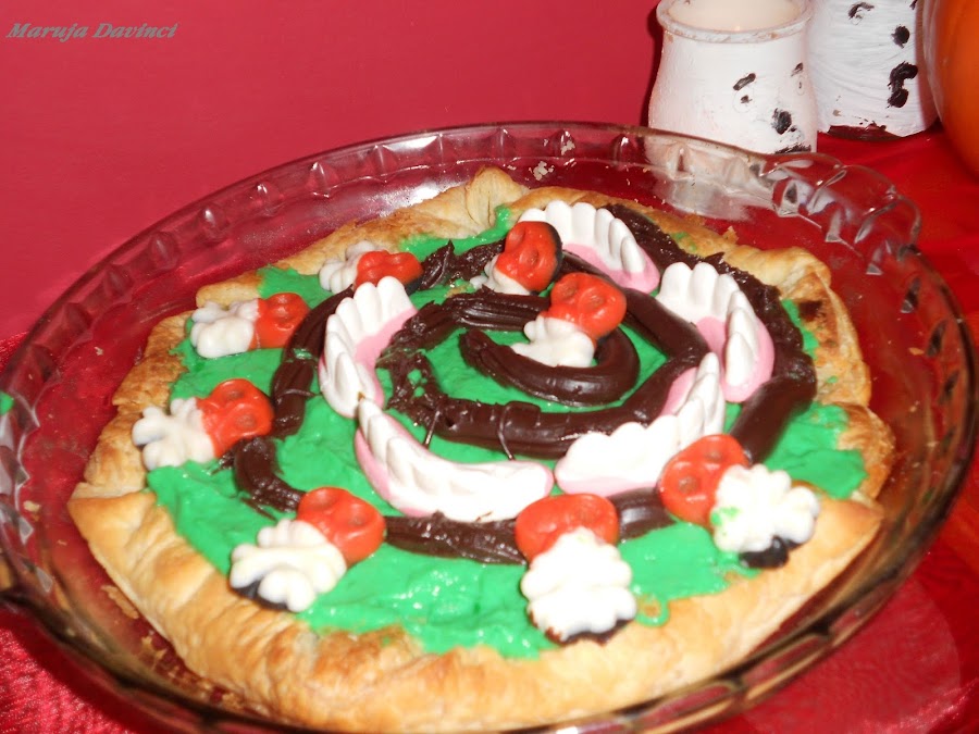 Hice una tarta pantanosa pútrida, basada en una idea que vimos mi hija y yo ( a ella le encantó) en el blog de Jesús Delgado, http://www.cocinafacilyelaborada.com/2015/10/la-cosa-del-pantano-dulces-de-halloween.html