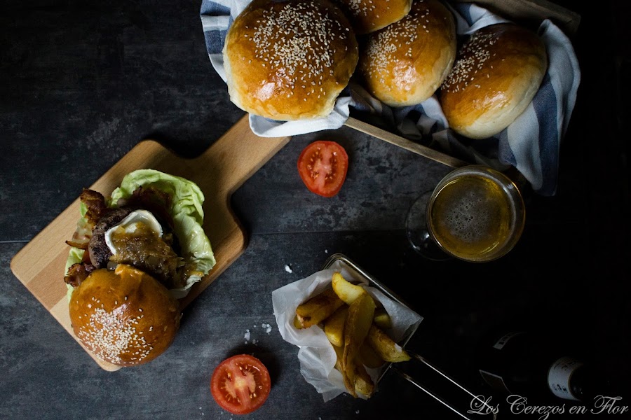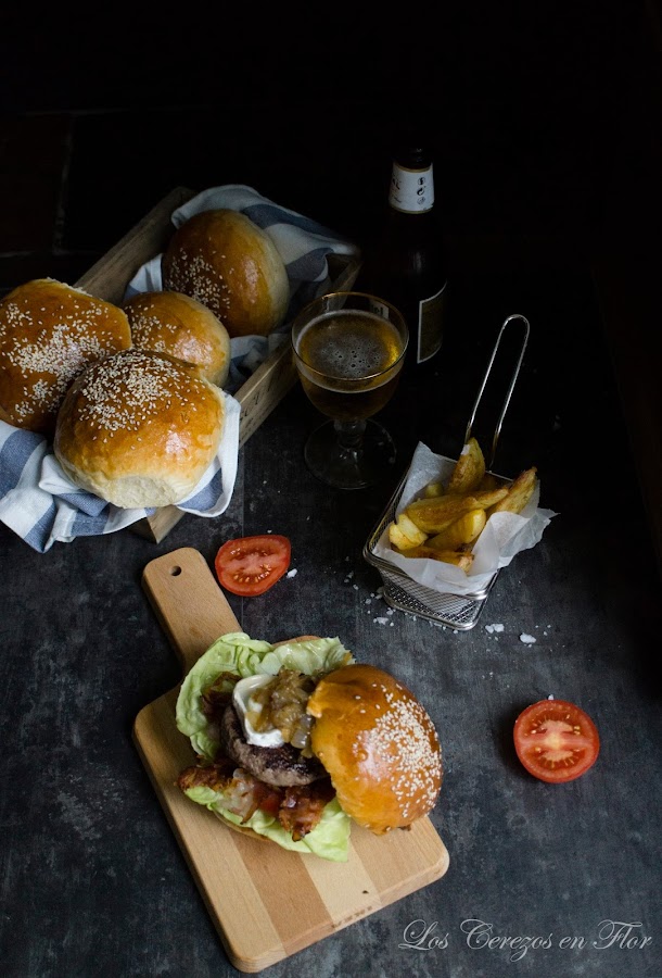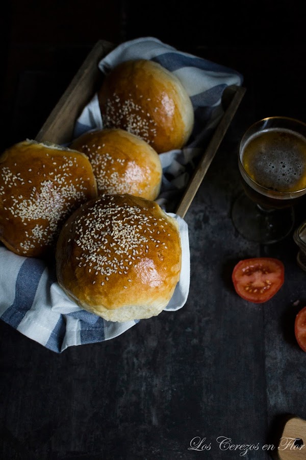 Aquí en Suiza la ternera es cara, y mucho más si la quieres de calidad. De camino al trabajo de mi marido hay una carnicería que al vender al por mayor los precios son más ajustados y la calidad de los productos es excepcional. Así que cada vez que hago hamburguesas en casa para allá que me voy, elijo la pieza de carne que más me gusta o que él me aconseja y me la pica allí mismo, delante mía. Luego los ingredientes que utilizo para mezclarla va a gusto de mis comensales, uno es más de hacerla estilo flamenquín, con su buen jamoncito picado y su aceite de trufa, y en cambio el otro la prefiere al estilo inglés con su salsa worcestershire, tomate concentrado y ajo picado. Para gustos colores no?. Lo que puede complicar aquí un poco la receta es hacer los panecillos. Se tarda un rato pero vale muchísimo la pena, y además sois afortunados, porque después de probar varias recetas os traigo la buena, la que sale perfecta, tiernos, con un sabor fantástico y una consistencia que aguanta a las mil maravillas el peso del relleno. Sólo hay una dificultad, y lo siento mucho pero no dispongo de la solución al tema, lo vais a pasar realmente mal cuando después de pasar unas horas en la cocina preparando los panes nunca llegarán a sujetar en su interior una hamburguesa porqueeeeeee.....se los comerán aunque se quemen la boca en cuanto los saques del horno!!!!! Siempre me pasa lo mismo!! Con esta receta me salen unos 8 panecillos, pues como se de que palo va mi familia, siempre doblo los ingredientes para que me sobren algunos para la cena jajajaja. Yo los he hecho de 150g cada uno, porque mi marido dice que el no quiere mariconadas enanas donde se desparrame todo, el quiere estilo machote, grandes y que se puedan coger con las dos manos y que los dedos no se crucen en el camino jajajajaja, lo que hace la gula!!! No me extraña que sea un pecado capital!! En fin, yo con contentar a los míos hago lo que haga falta!! Aprovecho la entrada de hoy para felicitar a nuestra salmantina más guapa y maravillosa del mundo mundial Rosa al igual que a mi barcelonesa más querida que es mi hermana mayor postiza Maragda , ambas cumplen años!!! Lo que daría yo por compartir estos manjares con vosotras bellas flores de mi jardín!!