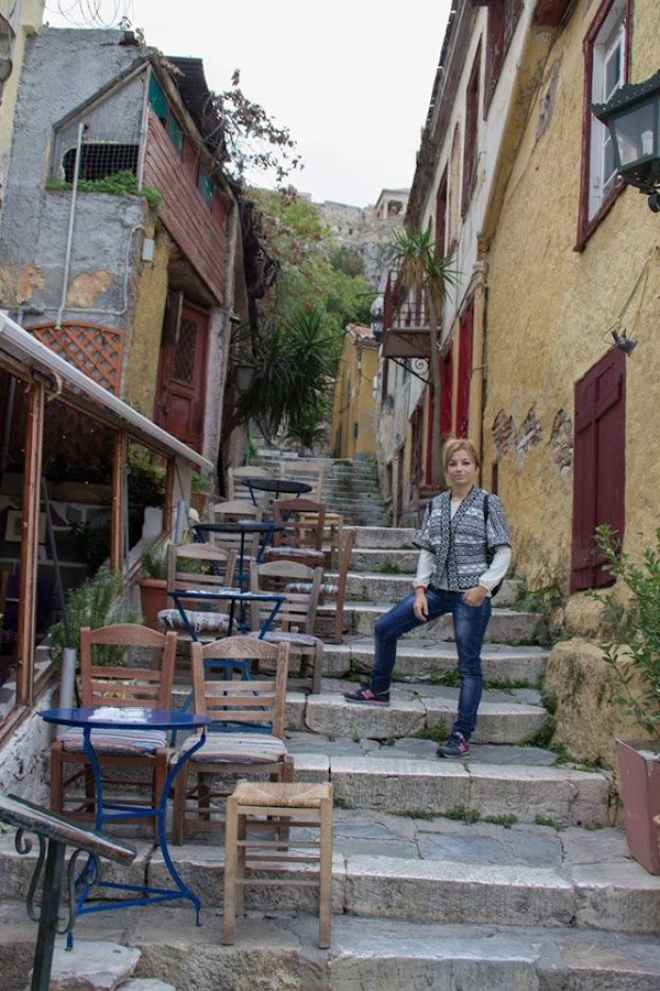 Si vais a ir a la Acrópolis (visita obligada allí) tenéis que ver también el barrio de Anafiotika , a los pies de la misma. En ese barrio nos decidimos a comer en un pintoresco restaurante de los que se asientan en las escaleras de las calles (no recuerdo el nombre del sitio ni tampoco viene en TripAdvisor) en el que nos soprendió ver una "hamburguesa a la griega" .Como buenos amantes de las hamburguesas (pincha aquí para ver más en nuestro blog), no dudamos en probarla. Estaba muy buena, así que de paso preguntamos al cocinero qué ingredientes llevaba.... Imaginar la conversación, entre medio griego (que no tenemos ni idea) y medio inglés y tras 15 minutos de intensas explicaciones y desesperación, el resultado es más o menos este: