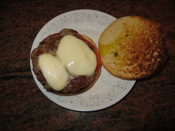 Tostamos el pan, cortamos en rodajas el tomate y la mozzarella. Cuando esté la carne casi echa, untamos en ambas caras un poco del aceite de albahaca que hemos preparado, también utilizamos este aceite para untar una de las caras del pan de la hamburguesa. Encima de la carne colocamos la mozzarella para que se nos derrita un poco, este paso nos lo podemos saltar y colocarla directamente encima del pan.