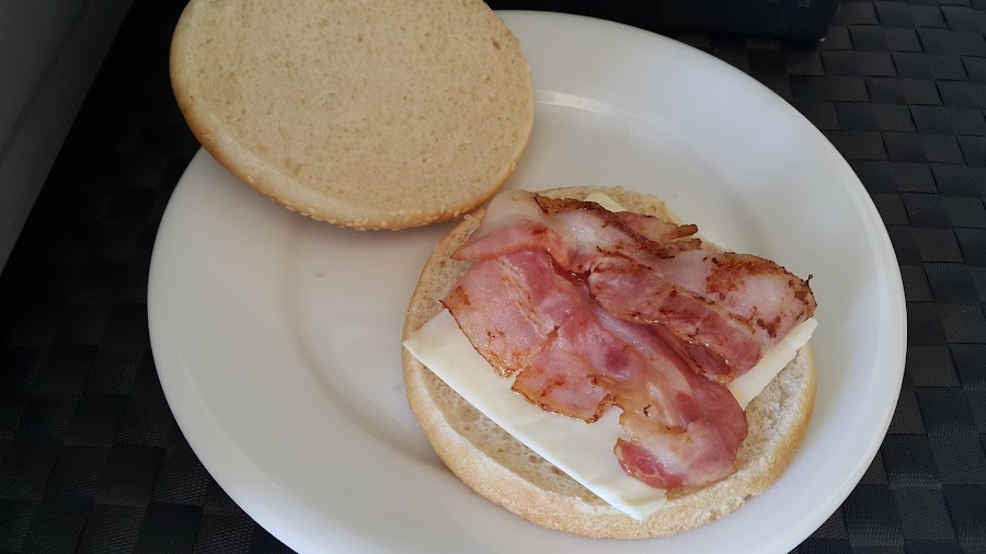 En cuanto tengamos la carne lista procedemos a montar la hamburguesa. Ponemos una loncha de queso justo encima del pan seguido del bacon.