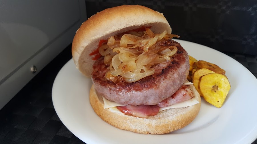 Añadimos otra loncha de queso, la carne y la cebolla caramelizada. A continuación echamos las salsas que nos gusten. Para terminar acompañamos con el plátano macho a modo de patata frita.